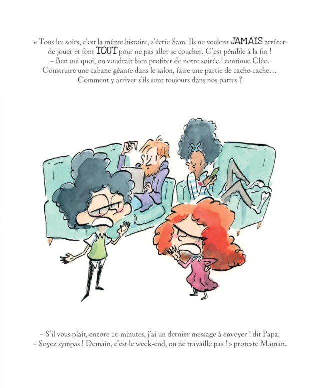 Comme tous les matins, c’est la course : Sam et Cléo doivent emmener leurs parents au travail. Mais ils risquent d’être en retard car Maman préfère jouer à la maison et Papa met un temps fou à sortir du lit…